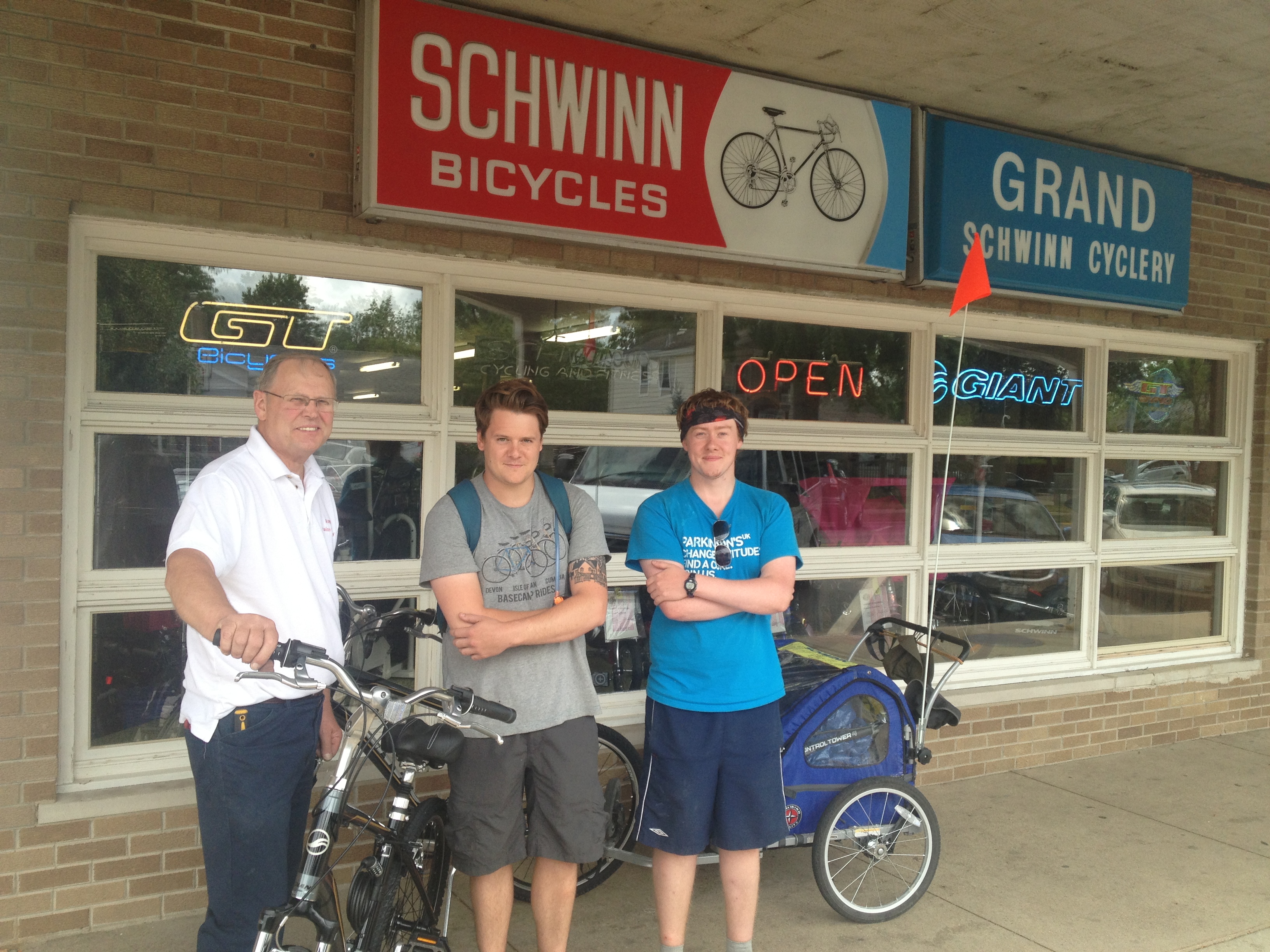 The Grand Schwinn Cyclery just happened to be the only bike shop for about 60 miles in any direction, and its owner, Roy, sized us instantly and was able to tell us exactly what bikes we’d be needing. I say instantly, we ended up spending nearly four hours in the shop, but it gave us plenty of time to charge all of our equipment. Roy sorted us out with 2 identical bikes, padlock, road flag, spare inner tubes, and he sorted out the wheels on our cart for us. We’d later go to a bar about 10 miles down the road to have a late birthday drink, and be told by more than a few people that we had encountered “Rip-off” Roy. I’ve got to say I think this was a fully undeserved nickname, seeing as he threw so much free stuff in and even gave us a discount.